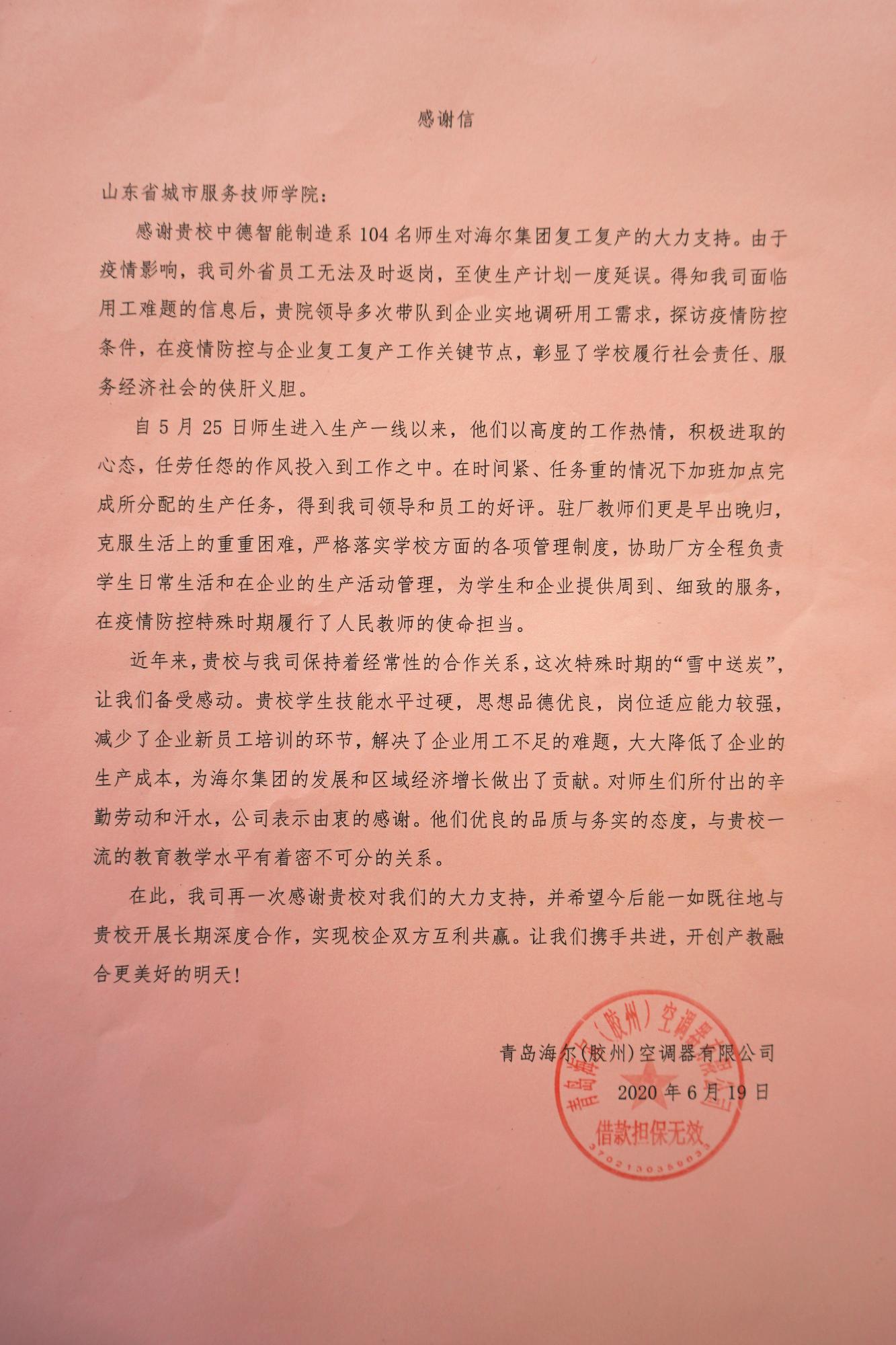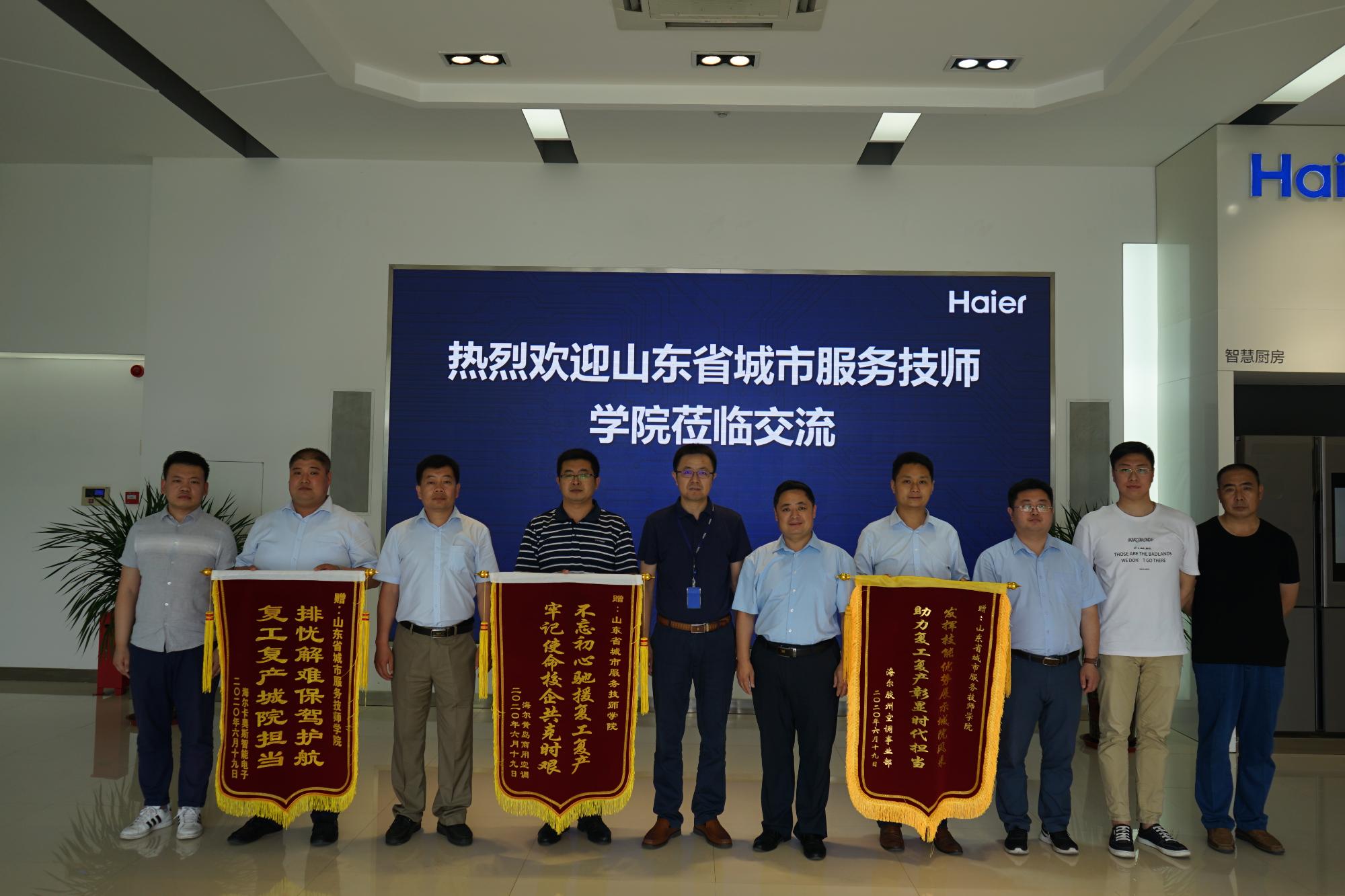 6月19日,學院黨委副書記刁洪斌帶隊赴青島海爾集團,看望慰問支援復工復產(chǎn)的一線師生。海爾集團西北大區(qū)人力資源部部長汪濤、海爾集團膠州空調(diào)廠區(qū)總經(jīng)理許磊以及海爾集團卡奧斯智能電子有限公司總經(jīng)理高廣偉,代表企業(yè)對學院師生所展現(xiàn)的優(yōu)良思想品質(zhì)與務實工作作風給予高度贊揚。企業(yè)認為,學院構建的紅色思政教育、工匠精神與感恩教育“三位一體”立德樹人新模式,從精神和靈魂深處為培養(yǎng)“下得去、上手快、留得住、用得上”的技能人才奠定了思想文化基礎,最大程度降低了學生流失率。尤其是在疫情防控的特殊時期,學院積極馳援,助力復工復產(chǎn),更是彰顯了省城市學院師生履行社會責任、服務經(jīng)濟社會的拳拳之心。他們希望深入推進雙方合作的廣度和深度,在招工招生一體化、人才培養(yǎng)模式創(chuàng)新、企業(yè)教師工作站建設等方面,打造校企合作的“齊魯樣板”,希望在學院投資建設生產(chǎn)型實訓中心和面向社會的職業(yè)技能培訓基地,并向?qū)W院贈送了錦旗和感謝信。