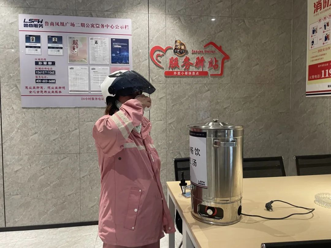驛站為快遞小哥們準備了桌椅板凳、應急藥箱,同時準備了綠豆湯等免費飲品,能夠滿足快遞小哥們吃飯、交流和簡單的休息需求。“我們希望通過驛站的建立,更廣泛、更直接、更有效的服務新就業形態勞動者,用實際行動踐行詮釋‘五心’服務理念。同時,也方便他們更好地服務我們的業主,實現善意的循環,共同營造溫馨、和諧的社區環境。”鳳凰廣場項目負責人表示。