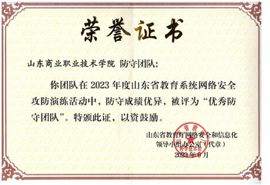 9月12日,2023年國(guó)家網(wǎng)絡(luò)安全宣傳周山東省校園日活動(dòng)啟動(dòng)儀式上對(duì)2023年度山東省教育系統(tǒng)網(wǎng)絡(luò)安全攻防演練表現(xiàn)突出的攻擊隊(duì)伍和優(yōu)秀防守單位進(jìn)行現(xiàn)場(chǎng)表彰,山東商職學(xué)院獲評(píng)“優(yōu)秀防守團(tuán)隊(duì)”。
