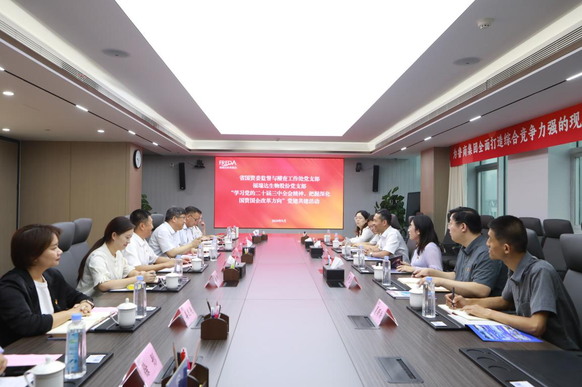為深入學習貫徹黨的二十屆三中全會精神,進一步促進黨建與業務雙融雙促,9月10日,省國資委監督與稽查工作處黨支部與福瑞達生物股份黨支部開展“學習黨的二十屆三中全會精神,把握深化國資國企改革方向”黨建共建活動。省國資委黨委委員、副主任葛志強,監督與稽查工作處處長林娜,魯商集團黨委常委、副總經理,福瑞達黨委書記、董事長賈慶文,及共建雙方有關人員共同參加活動。