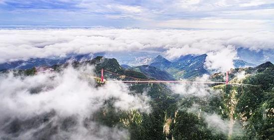 據(jù)了解,目前世界上較長的懸索橋有瑞士的歐洲之橋(494米)、德國的“泰坦-RT”步行懸索橋(458米)、俄羅斯的索契天空公園橋(439米)、中國湖南張家界玻璃橋(430米)。而銀座天蒙景區(qū)的人行懸索橋全長505.5米,在被群山環(huán)繞的天蒙景區(qū)里,它橫跨兩座山峰,凌空而起,是連接玉皇宮和望海樓兩個重要景點的交通要道。該人行索橋的建成避免了游客穿過深達143米的婁子溝,節(jié)約40分鐘的行程。