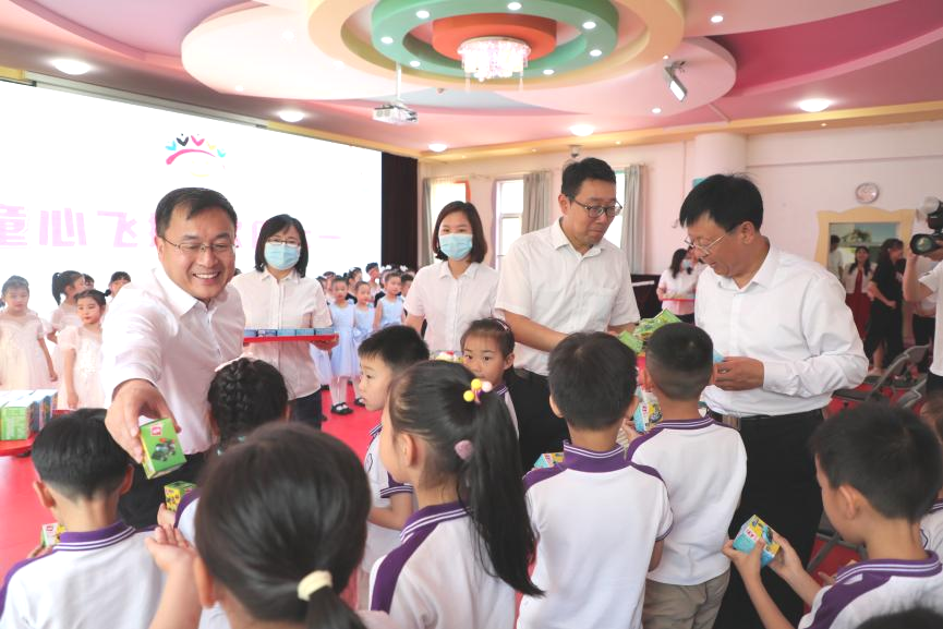 朱華建一行將精心準備的圖書、文具、玩具等節日禮物送到孩子們手中,并與孩子們親切互動。