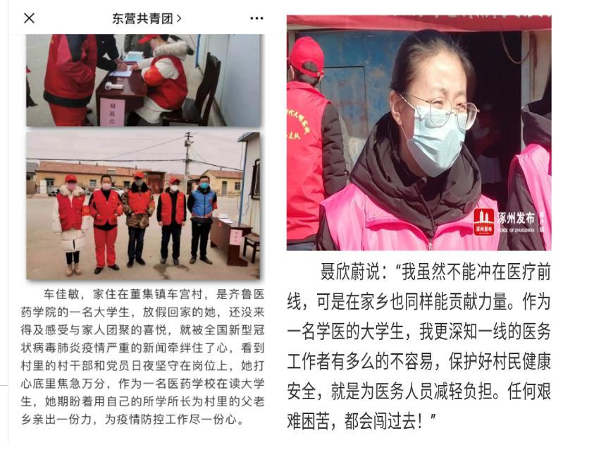 護理學院2017級護理學本科2班車佳敏同學,中共預備黨員。加入東營市墾利區董集鎮車宮村疫情防控志愿者隊伍后,她利用所學知識為鄉親們科普預防新型冠狀病毒的實招,同時做好值班巡邏、進出人員登記管理、入戶宣傳等工作。她的個人先進事跡先后被董集鎮政府、墾利區團委、東營市團委官方微信公眾號所報道。她表示,作為一名青年預備黨員,在黨和人民群眾需要的時候,挺身而出是義不容辭的責任。2018級護理專科2班的聶欣蔚同學,在疫情防控工作中,表現出色,其個人事跡被當地政府官方微信“涿州發布”報道。