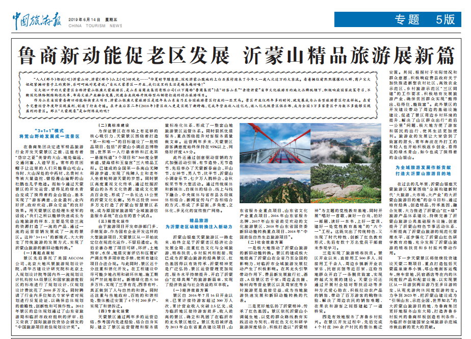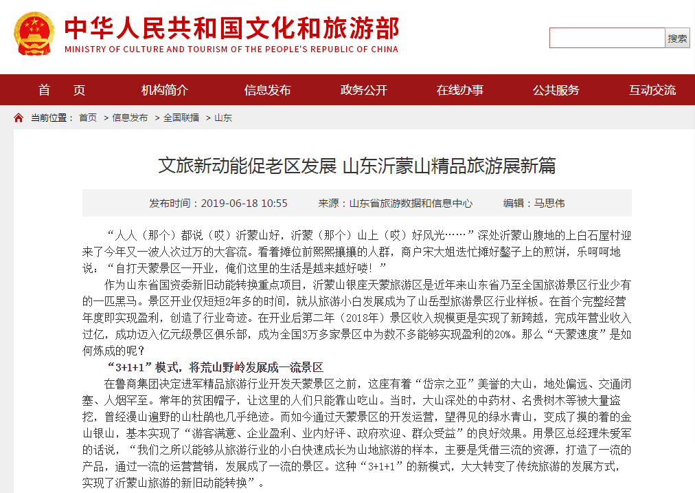 近日,文化和旅游部網(wǎng)站轉(zhuǎn)載中國(guó)旅游報(bào)文章《魯商新動(dòng)能促老區(qū)發(fā)展 沂蒙山精品旅游展新篇》,對(duì)山東省國(guó)資委新舊動(dòng)能轉(zhuǎn)換重點(diǎn)項(xiàng)目——魯商集團(tuán)所屬沂蒙山銀座天蒙旅游區(qū)發(fā)展模式進(jìn)行關(guān)注。以下為報(bào)道全文: