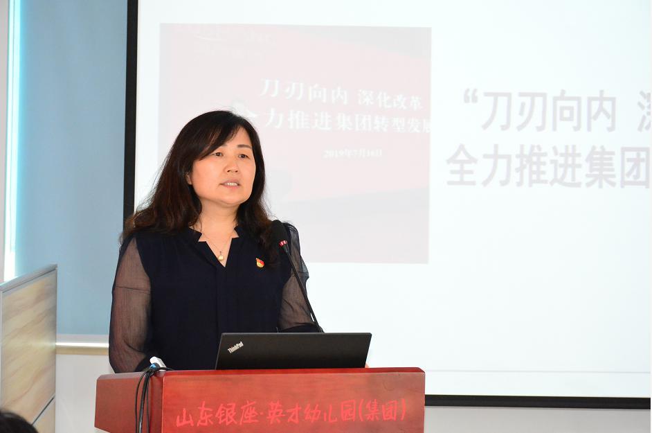 7月23日下午,銀座幼教召開2019年度半年工作會議。會上,銀座幼教黨總支書記、董事長焦敏傳達了省商業集團有限公司(以下簡稱魯商集團)黨委書記、董事長兼省文旅集團董事長高洪雷在集團半年度工作會議上的講話精神,并對2019年下半年工作進行部署,銀座幼教總部全體成員、基地園園長參會。