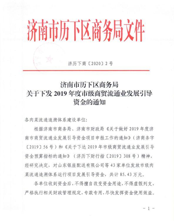 近日,山東銀座配送有限公司在歷下區(qū)商務(wù)局組織的2019年度《濟(jì)南市肉菜流通追溯體系建設(shè)》評選中再獲佳績,在43家參評單位中位居第一名,獲得補(bǔ)貼19.09萬元,占補(bǔ)貼總金額的22%。