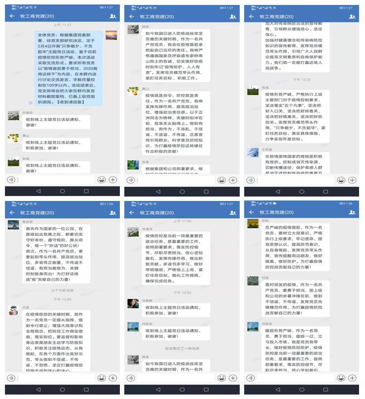 鑒于目前疫情防控形勢嚴(yán)峻,本次主題黨日活動采取線上交流形式,所有黨員以“疫情面前勇于擔(dān)當(dāng),2020我將這樣干”為內(nèi)容,在企業(yè)微信群內(nèi)進(jìn)行了討論交流發(fā)言,切實做到了防控疫情我?guī)ь^、政治學(xué)習(xí)不掉隊、黨員先鋒在行動。