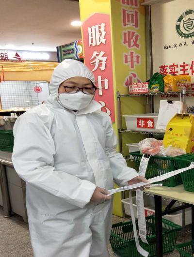 作為工作在零售系統最前沿的收銀員工,因崗位的特殊性,每天要與大量的顧客接觸。為保護好員工,也為保證顧客安全,馬寧四處聯系購買防護服、口罩、手套、頭套等防護物資,在病毒肆虐的早期,就將收款員進行了從頭到腳的“全副武裝”。在馬寧的帶領下,門店收款區域堅持每半小時一消毒;她還給每位收銀員都配備了小瓶配置好的酒精,以便隨時消毒;安排每位在崗員工輪流、多次到門外空曠處呼吸新鮮空氣,全力保障員工身心安全。同時,員工吃飯時她來頂崗,客流量大時她加開款臺進行增援。馬寧總能出現在最需要的地方,極大保障了收銀工作的流暢開展。