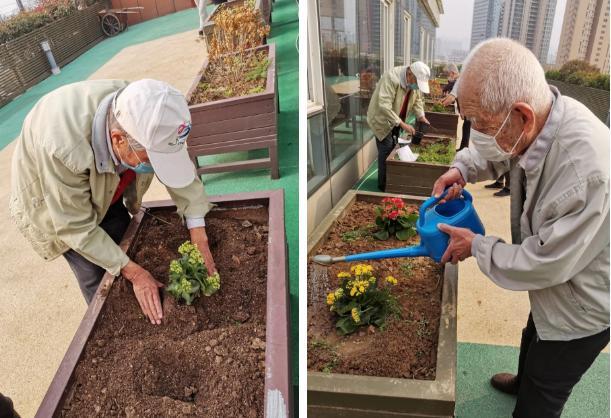 魯商福瑞達(dá)國際頤養(yǎng)中心的長者代表們則到頤養(yǎng)中心六樓的室外活動(dòng)區(qū),在“空中花園”里種下一束束長壽花,祝福天下長者身體健康。