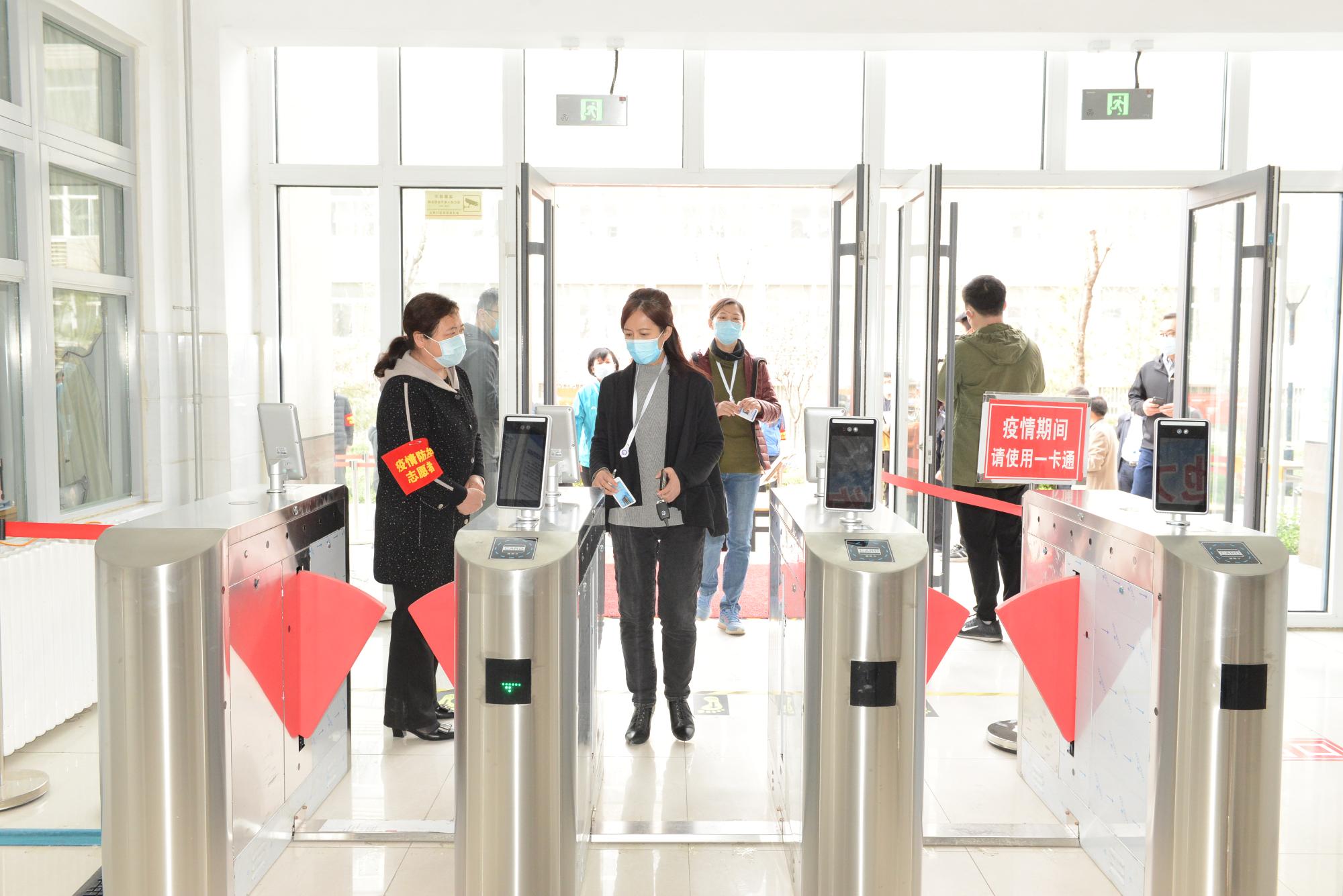 在公寓門口,演練人員佩戴口罩間隔1米依次排隊測體溫、消毒后,持一卡通通過門禁,再持樓層出入證進行體溫登記后進入房間。現(xiàn)場還模擬了體溫異常學(xué)生處置流程。