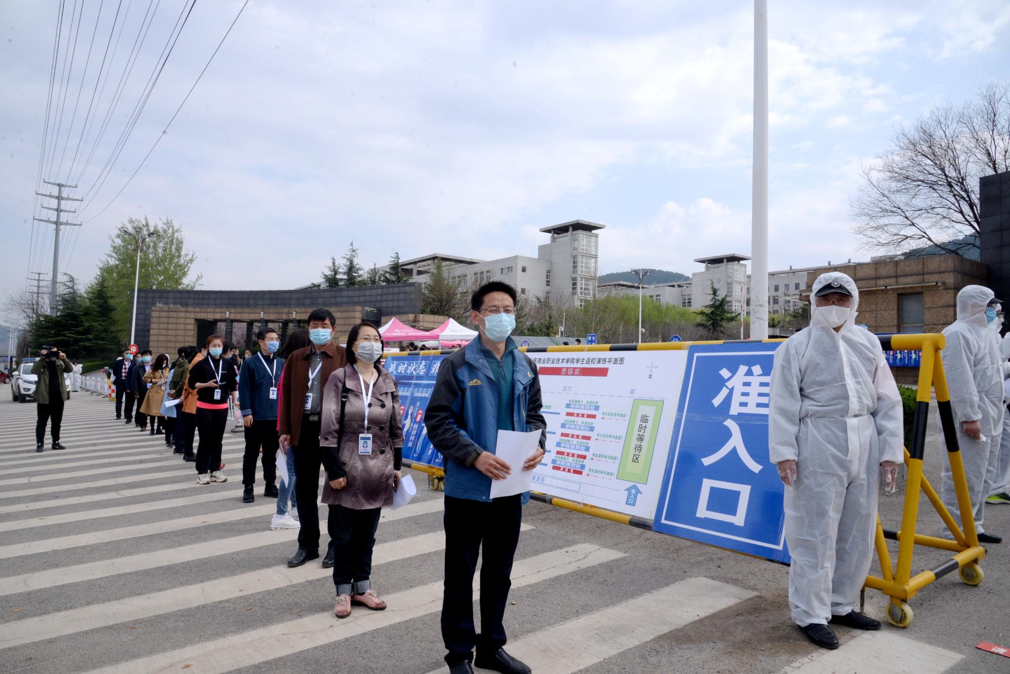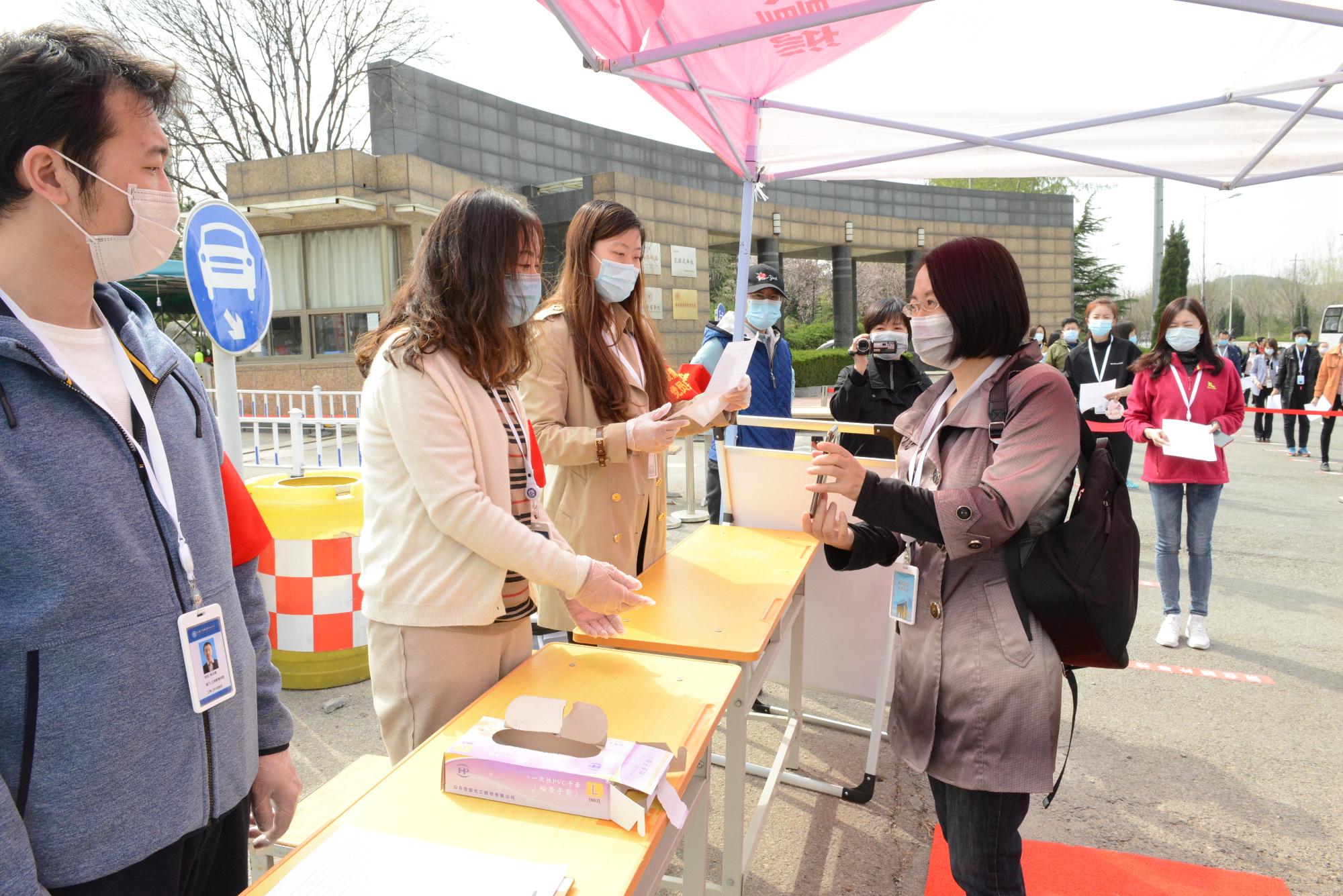在校門口,演練人員模擬學(xué)生下車后進行個人及行李箱消毒、檢測體溫等程序,按照工作人員引導(dǎo)到各學(xué)院現(xiàn)場報到通道,辦理入校手續(xù)。按照防控規(guī)范前后間隔1米的距離,工作人員收取學(xué)生返校承諾書,有序進行體溫測量、身份登記以及電子健康通行碼核驗后進入校園?,F(xiàn)場還模擬了體溫異常學(xué)生處置流程。