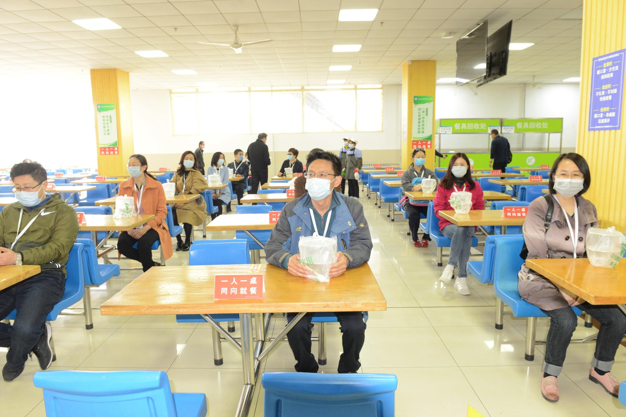 演練人員間隔1米距離,有序排隊先行測溫,經(jīng)過消毒毯后進入就餐場所。按地貼提示進行洗手,洗手臺按規(guī)范放置了肥皂、消毒洗手液、紙巾等洗消物品。學(xué)生們提前了解了餐廳準備的多種套餐,間隔1米排隊進行套餐選取后分散就座,學(xué)生一人一桌同向就餐,就餐后將餐余垃圾統(tǒng)一扔到回收處,從指定出口離開。餐廳消殺規(guī)范,門窗氣流通暢。