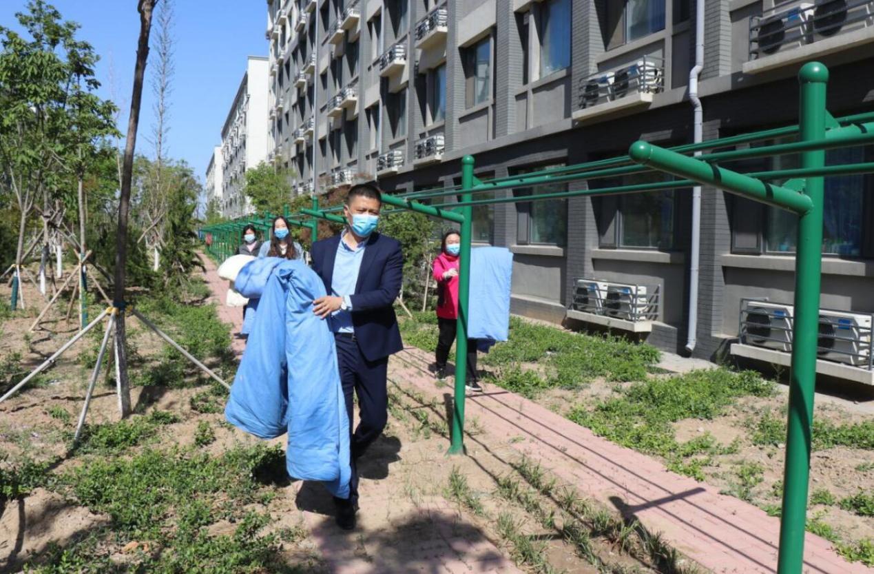 4月20日,團委學(xué)生處會同二級學(xué)院向同學(xué)們發(fā)出需求征集信息,學(xué)生通過班級群反饋需求,輔導(dǎo)員逐一記錄。4月22日,風(fēng)輕云淡,陽光正好,70余名老師樓上樓下開始忙碌,把學(xué)生被褥抱出宿舍,一件件晾曬在公共晾衣桿上。夕陽西下時,按照標(biāo)識再一件一件抱回宿舍。
