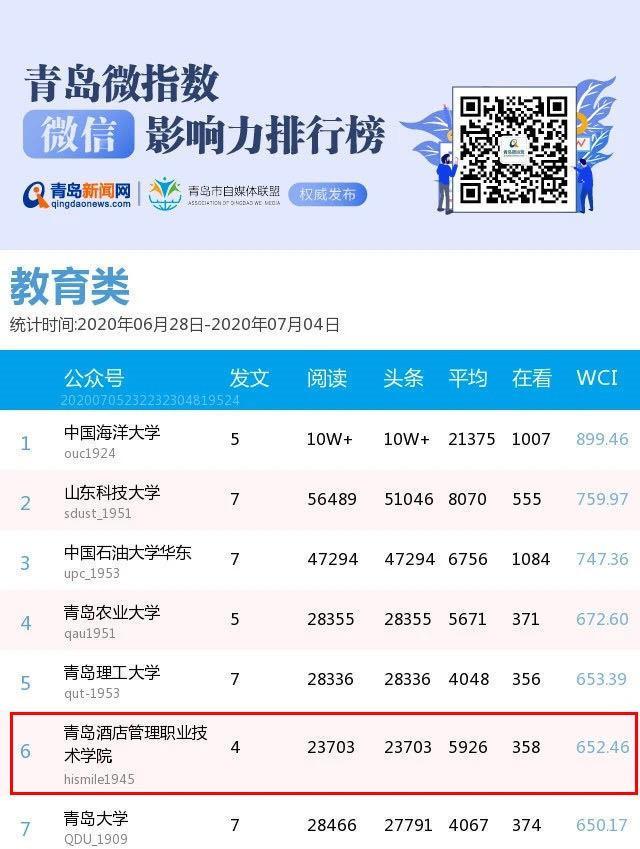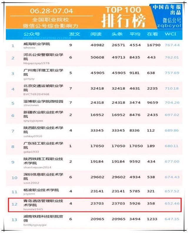 7月6日,中國青年報發(fā)布“全國普通高校微信公號排行榜(6.28-7.4)”,青島酒店學院官方微信公眾號“青島酒店管理職業(yè)技術(shù)學院(hismile1945)”綜合影響力入圍全國職業(yè)院校第12位,4篇推文全部進入全國職業(yè)院校單周文章閱讀量TOP100排行榜。