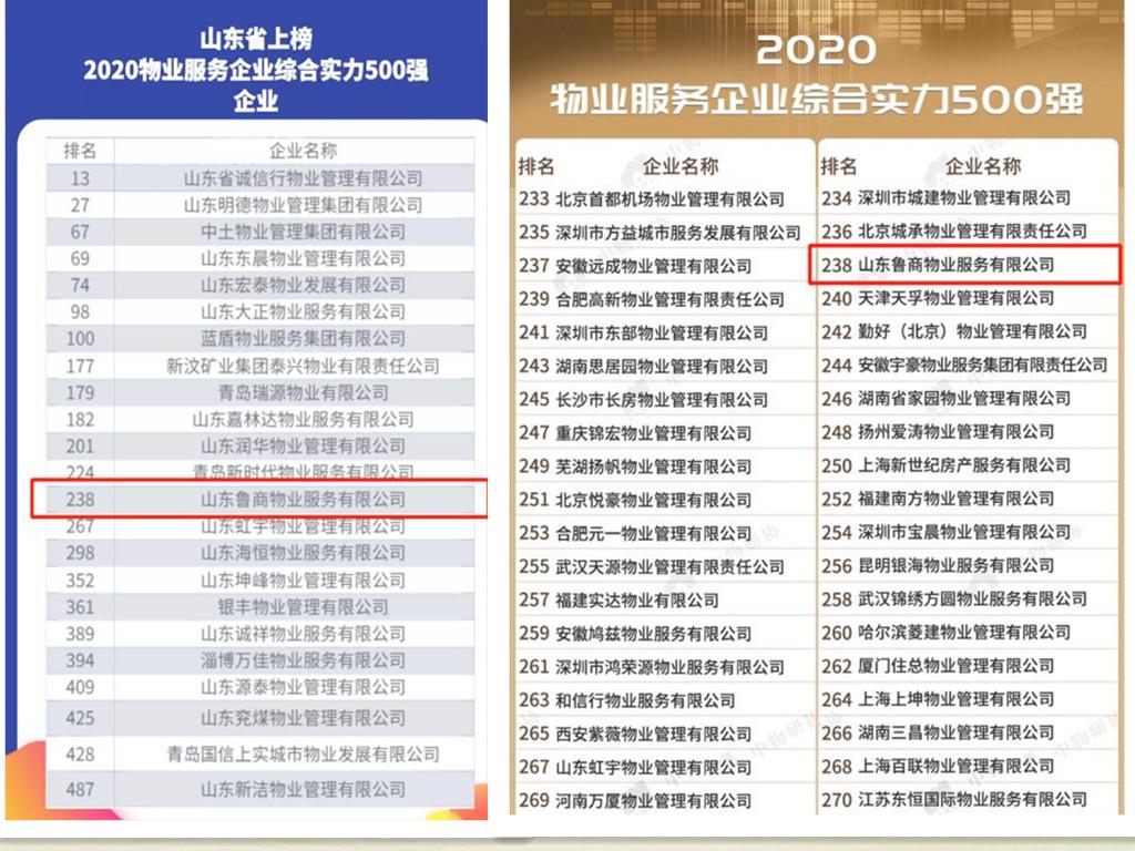 9月29日,中物研協(xié)和上海易居房地產(chǎn)研究院中國房地產(chǎn)測評中心聯(lián)合舉行了2020物業(yè)服務(wù)企業(yè)綜合實(shí)力和品牌價值測評成果發(fā)布會,山東魯商物業(yè)服務(wù)有限公司(簡稱魯商物業(yè))上榜“2020物業(yè)服務(wù)企業(yè)綜合實(shí)力500強(qiáng)”,位列第238位。其中,山東省上榜企業(yè)共23家,魯商物業(yè)列位第13位。