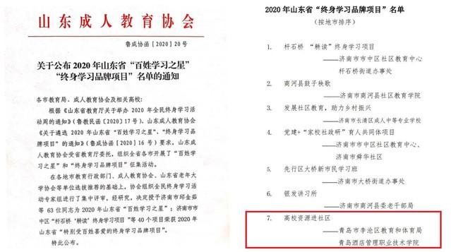 日前,根據(jù)《山東省教育廳關于舉辦2020年全民終身學習活動周的通知》要求,山東省成人協(xié)會組織公布了2020年省“百姓學習之星”和40個“終身學習品牌項目”名單,青島酒店學院與青島市李滄區(qū)教育和體育局聯(lián)合申報的“高校資源進社區(qū)”社區(qū)教育項目入選2020年山東省“終身學習品牌項目”。