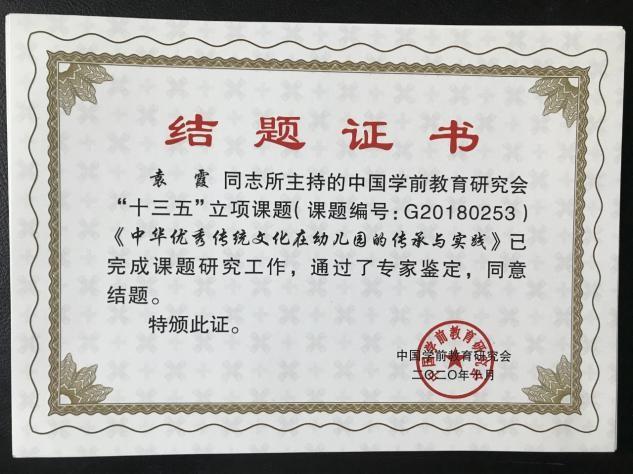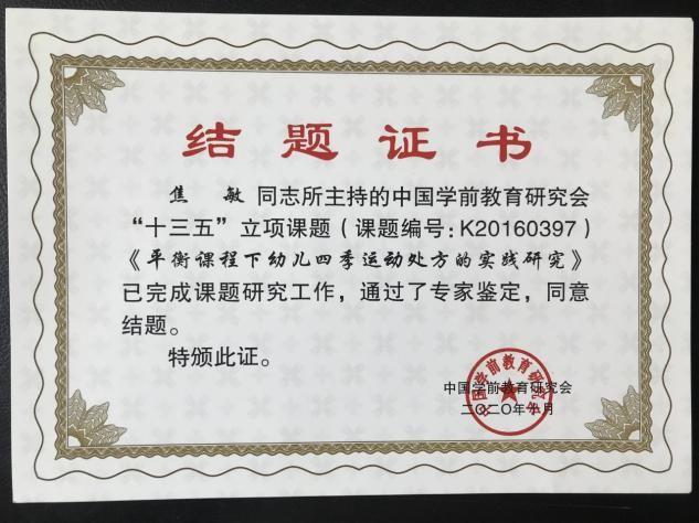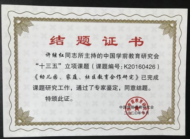 銀座幼教積極開展各類教科研課題的研究,由中國學(xué)前教育研究會立項(xiàng)的課題《中華優(yōu)秀傳統(tǒng)文化在幼兒園的傳承與實(shí)踐》(課題編號: G20180253)《平衡課程下幼兒四季運(yùn)動處方的實(shí)踐研究》(課題編號: K20160397)《幼兒園、家庭、社區(qū)教育合作研究》(課題編號: K20160426)完成課題研究工作,通過專家鑒定,順利結(jié)題。