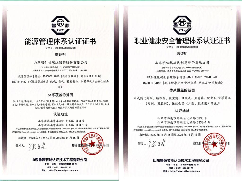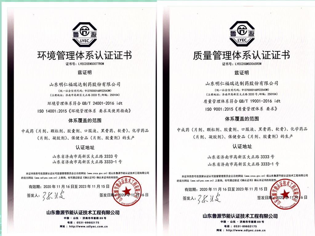 明仁福瑞達(dá)自推行四項(xiàng)管理體系以來(lái),不斷完善制度建設(shè),嚴(yán)控產(chǎn)品質(zhì)量、注重環(huán)境保護(hù)、優(yōu)化能源結(jié)構(gòu)、關(guān)注員工健康、緊抓安全生產(chǎn),爭(zhēng)做為員工提供安全工作環(huán)境、為人民提供優(yōu)質(zhì)健康產(chǎn)品的環(huán)境友好型企業(yè)。四項(xiàng)管理體系認(rèn)證證書(shū)的取得,是對(duì)公司質(zhì)量管理、環(huán)境管理、能源管理、職業(yè)健康安全管理等各項(xiàng)工作規(guī)范化、標(biāo)準(zhǔn)化的肯定。