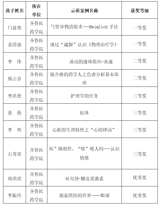 近日,省高等醫(yī)學(xué)教育研究中心公布了2021年度省高等醫(yī)學(xué)院校課程思政示范案例評選結(jié)果,齊魯醫(yī)藥學(xué)院申報的10項案例全部獲獎,其中一等獎2項、二等獎2項、三等獎4項、優(yōu)秀獎2項。
