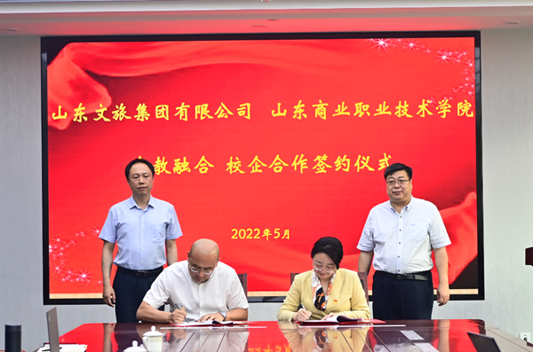 5月24日,山東商院與山東文旅集團舉行產教融合、校企合作簽約儀式。學院黨委書記張志東,黨委副書記、院長王鑫,山東文旅集團黨委副書記、總經理丁藝,黨委委員、副總經理孫超出席,學院黨委副書記宋超主持簽約儀式。