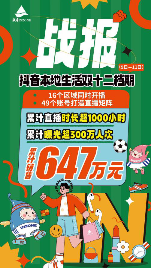 活動檔期,銀座集團各區域上午10:30準時在抖音平臺開啟直播盛宴,涵蓋貴賓卡、百貨、超市、美妝、美食、家電等品類,通過多種促銷方式聯動為門店引流聚客?;顒悠陂g,共有57個賬號同時開播,直播時長超1212小時,直播間曝光量超500萬人次。銀座集團還搶抓抖音本地生活“心動觀賽季”熱點,爭取平臺補貼近200萬元,銷售位居“到店綜合行業”第一名。