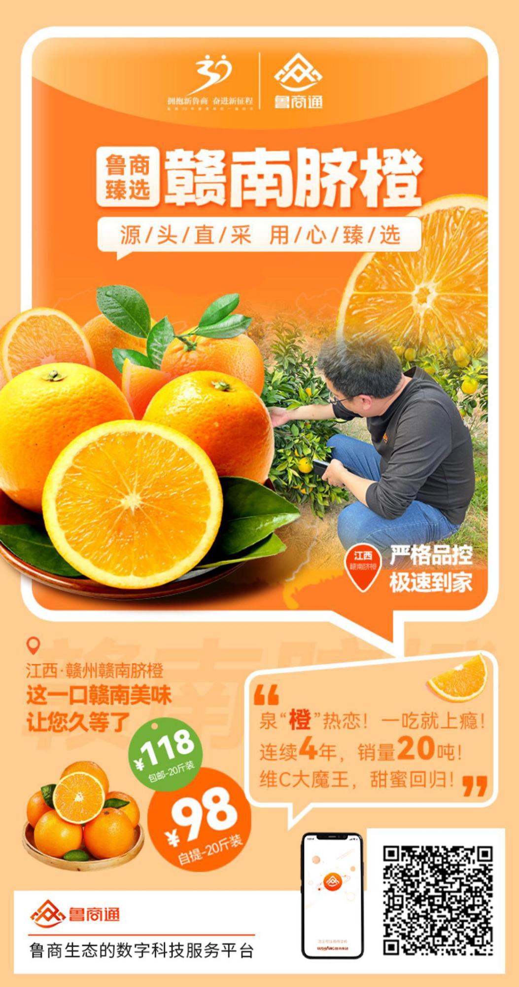 眼下正值贛南臍橙采摘旺季,為幫助果農(nóng)解決疫情和天氣等因素影響導(dǎo)致的銷售難題,魯商通利用“社群+電商+體驗中心”等多元化方式,上線6小時即售出3萬斤,3天時間6萬斤臍橙銷售一空。