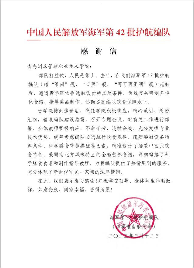 近日,青島酒店學院收到海軍第42批護航編隊發(fā)來的感謝信,對學校協(xié)助提高編隊飲食保障水平表示感謝。