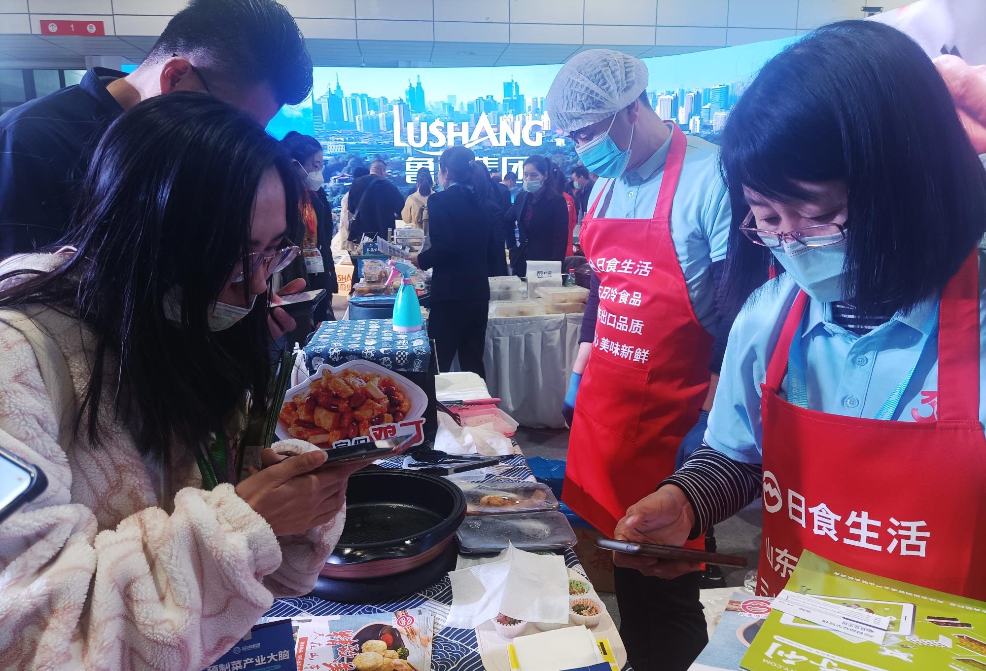 魯商集團展區內,多家產業單位大顯身手,使得參展菜品無比豐富。像即食類的手撕風干雞、特色紅燒肉、無骨鴨掌、千層酥、香辣海鮮炒飯、辣子雞丁飯,即烹類的奶油雞肉干酪焗飯、甜玉米魚滑、魚香蝦餅、宮保雞丁、麻婆豆腐、雞翅餃子,即熱類的非遺傳承菜品,即配類的烘焙海鮮等產品,可謂應有盡有。