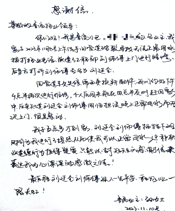 11月10日,魯商服務(wù)青島城市公司藍(lán)岸國(guó)際項(xiàng)目服務(wù)中心收到業(yè)主孫女士送來(lái)的手寫感謝信,感謝工程部水暖應(yīng)急小組的敬業(yè)與辛勤付出,為一家人溫暖過(guò)冬解除了后顧之憂。
