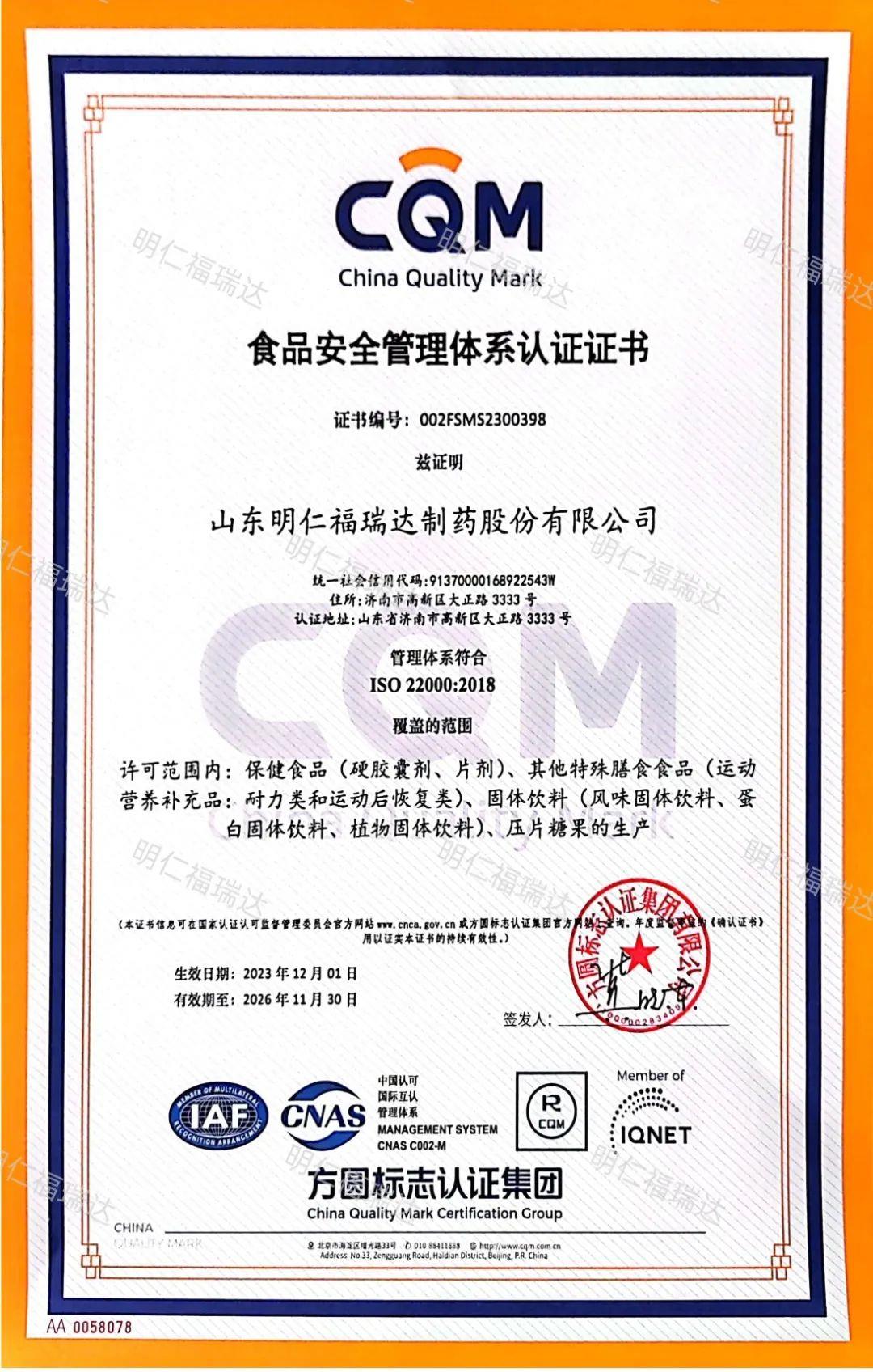 近日,明仁福瑞達順利通過食品安全管理體系和HACCP體系認證。