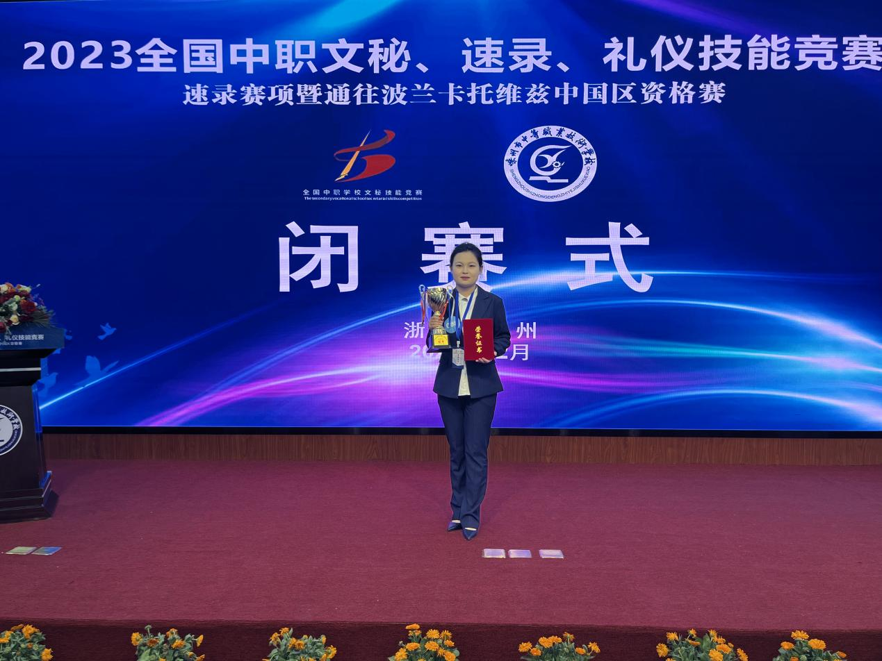 近日,2023全國中職文秘、速錄、禮儀技能競(jìng)賽速錄賽項(xiàng)暨通往波蘭卡托維茲中國區(qū)資格賽在浙江嵊州落下帷幕。山東城市服務(wù)職院商務(wù)文秘專業(yè)選手孫雨彤以542字/分的成績,斬獲“極限看打”全國冠軍,獲得波蘭卡托維茲國際速聯(lián)大賽的入場(chǎng)券。