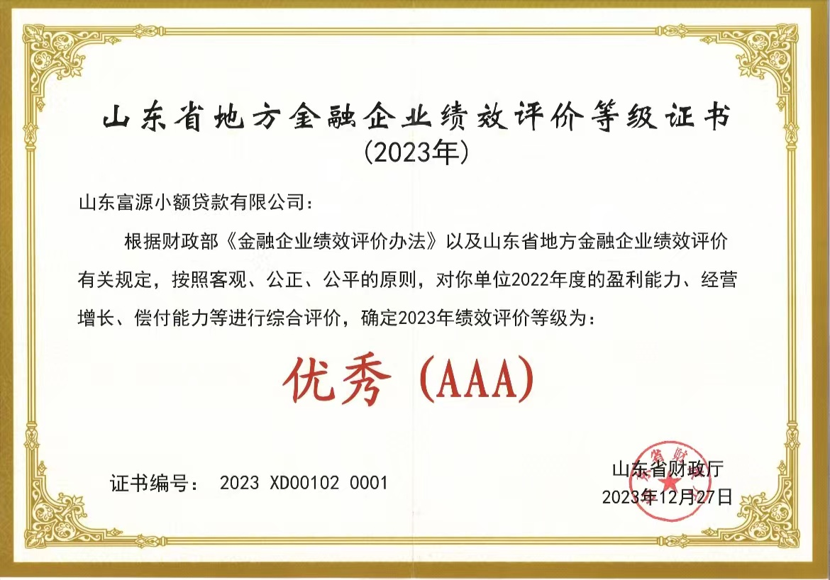 近日,富源小貸榮獲省財(cái)政廳頒發(fā)的2023年山東省地方金融企業(yè)績(jī)效評(píng)價(jià)“優(yōu)秀(AAA)”等級(jí)證書(shū),這是公司連續(xù)5年獲此殊榮。