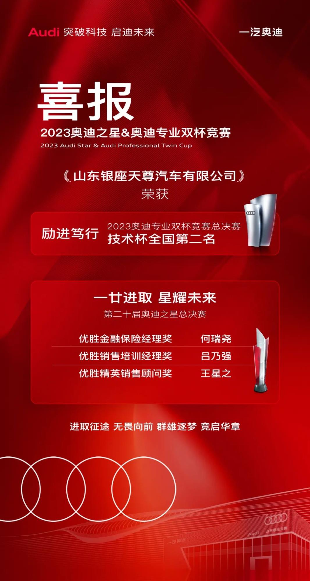 從心出發(fā),卓·悅無盡。奧迪雙杯競賽是展示經(jīng)銷商售后服務(wù)綜合實力的競技、交流和分享平臺。銀座天尊售后團(tuán)隊?wèi){借專業(yè)的技術(shù)知識和強(qiáng)勁的實操能力斬獲“2023年奧迪專業(yè)雙杯競賽-技術(shù)杯第二名”的殊榮。