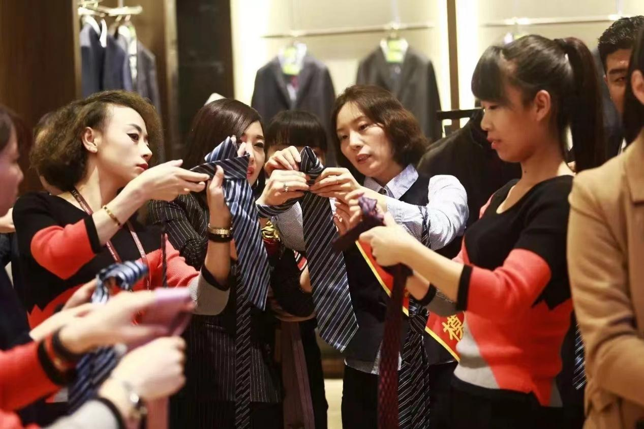 “我發現客戶在購買西裝時對領帶的需求也很高,有時會讓我們打好一起帶走,我就開始研究領帶,發現真是大有學問。先是學習領帶的材質、內襯、工藝、圖案等等,后來又發現單了解領帶也不行,還要根據穿著場景的不同進行選擇。至于扎系方法更是別有洞天,簡易結口、四手結、浪漫結、溫莎結、半溫莎結……,我就先從保證扎系美觀、規范入手,慢慢地追求速度上的突破和扎法上的豐富?!闭劦脚c領帶的結緣,于真真娓娓道來,難掩興奮。