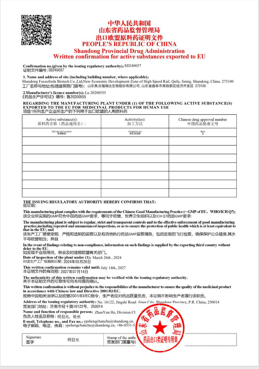 近日,經過嚴格審核評估,焦點福瑞達玻璃酸鈉原料藥成功獲得了由山東省藥品監(jiān)督管理局簽發(fā)的出口歐盟原料藥證明文件(WC認證),表明企業(yè)藥品生產質量體系符合GMP要求,具備向歐洲市場出口銷售的資格。