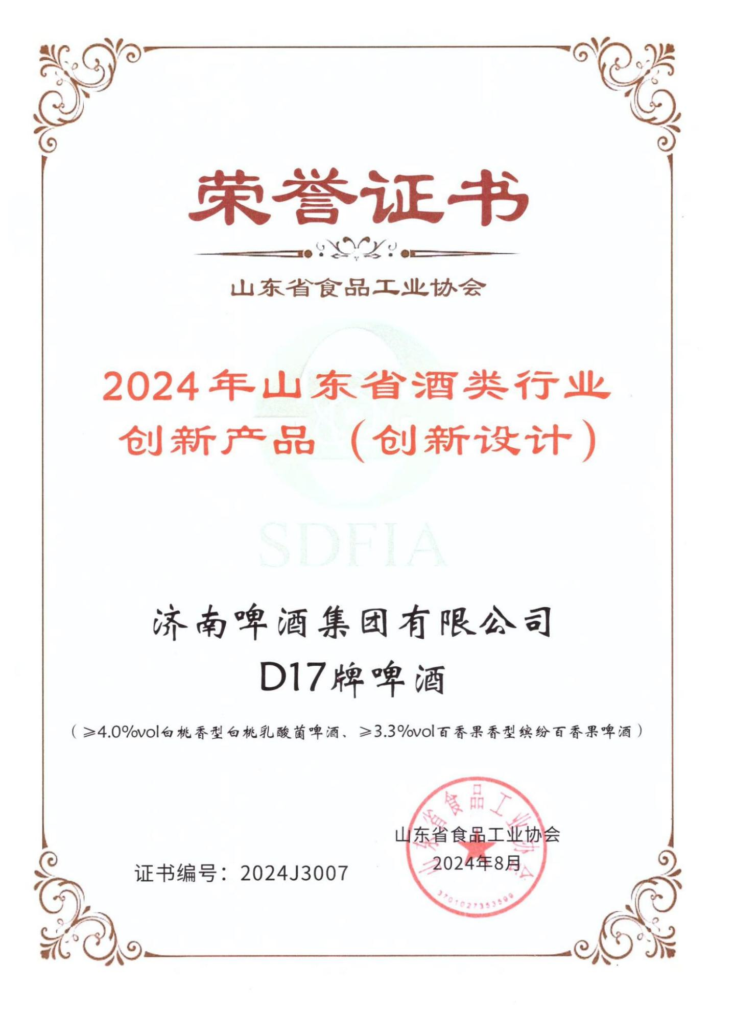 近日,在山東省食品工業協會舉辦的“2024年全省食品行業評委年會暨感官質量評價會”上,魯商投資旗下濟啤集團D17精釀啤酒憑借其卓越的品質和口感,榮獲本屆感官質量星級產品評價的最高榮譽——“5星級產品”以及“創新產品”獎。