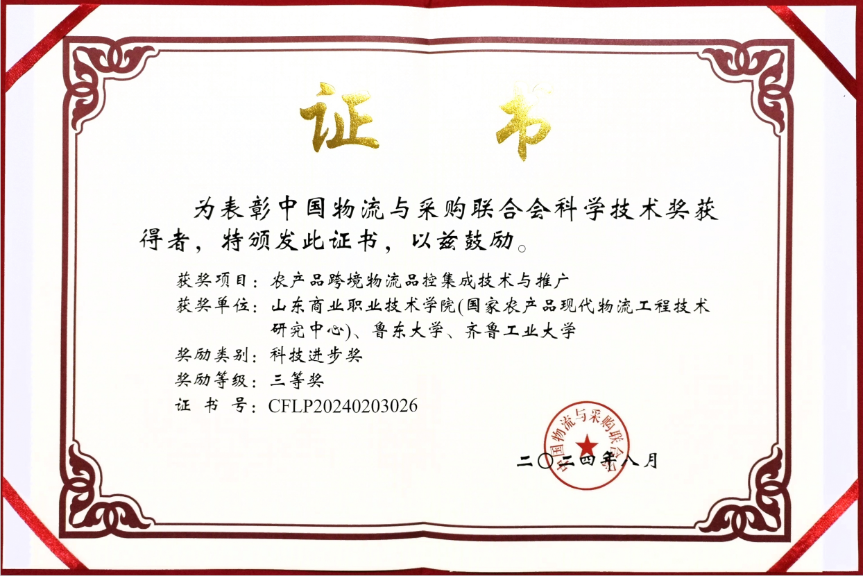 近日,2024年度中國物流與采購聯合會科學技術獎評審公布,由山東商職學院教師郭風主持的科研課題《農產品冷鏈物流品控集成技術與推廣》榮獲科技進步獎三等獎。