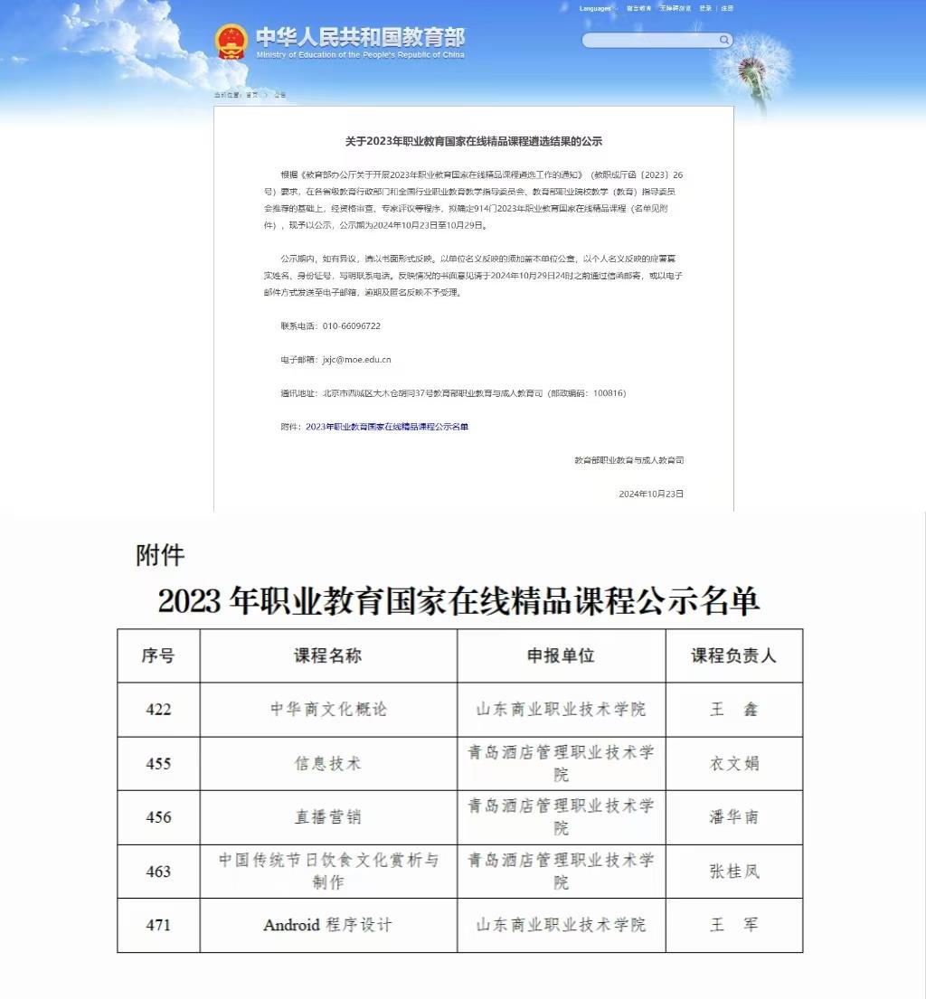 近日,教育部發布2023年職業教育國家在線精品課程遴選結果,經資格審查、專家評議等程序,914門課程入選2023年職業教育國家在線精品課程,山東商職學院2門課程、青島酒店管理職院3門課程入選。