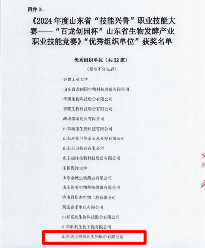 近日,2024年度山東省“技能興魯”職業技能大賽——山東省生物發酵產業職業技能競賽獲獎名單公布福瑞達旗下焦點福瑞達福瑞達生物科技、福瑞達生物股份憑借優異的競賽成績和良好的作風表現被大賽組委會評選為“優秀組織單位”。在職工組化學檢驗工、生化檢驗工、淀粉及淀粉糖制造工3個競賽項目中,13名職工榮獲個人三等獎