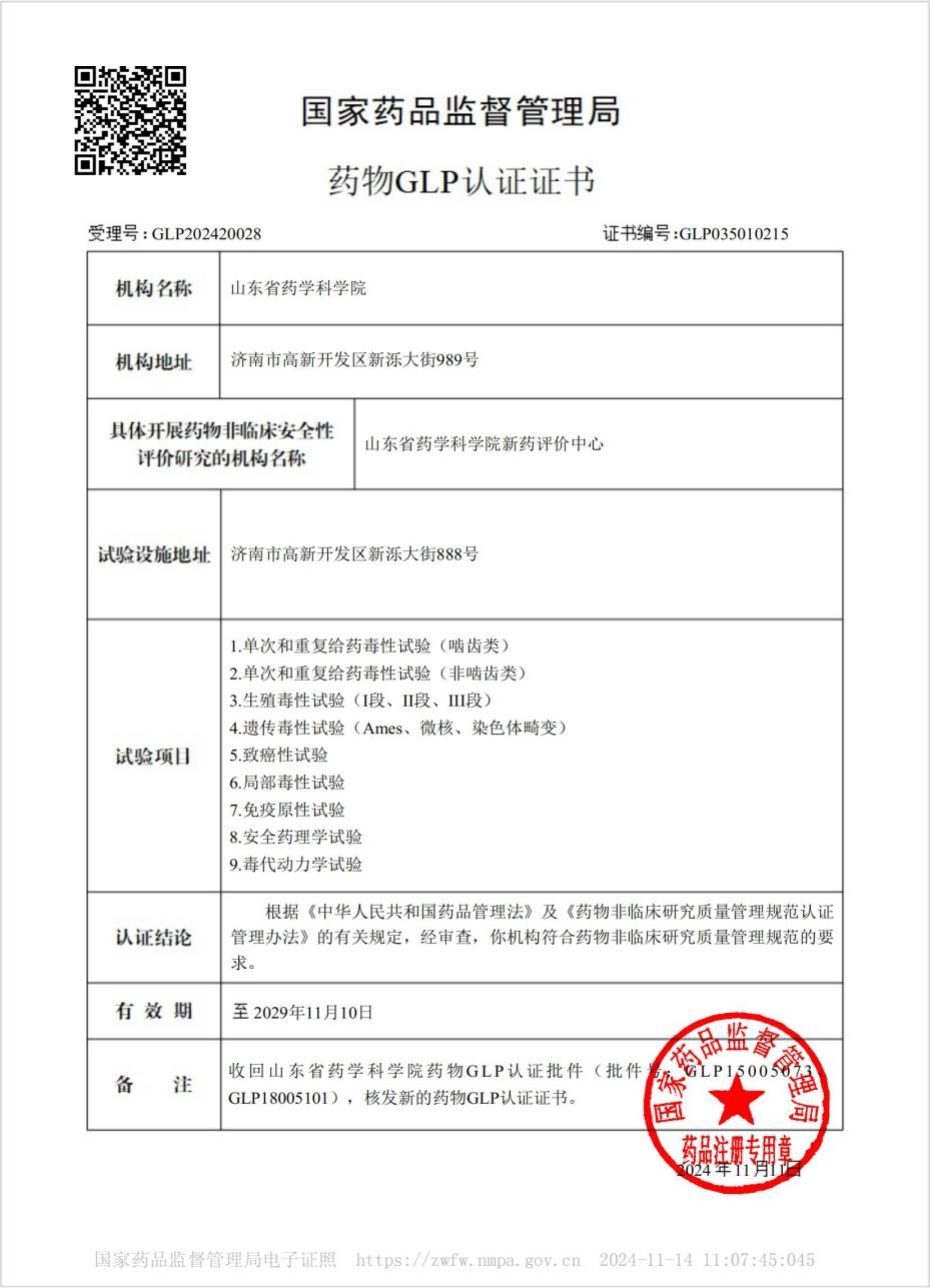 近日,魯商集團所屬省藥科院新藥評價中心收到國家藥品監(jiān)督管理局(NMPA)頒發(fā)的新版藥物GLP認證證書,認證項目涵蓋了9項試驗項目,標志著省藥科院在藥物非臨床研究質(zhì)量管理方面達到了國際公認的標準和規(guī)范。