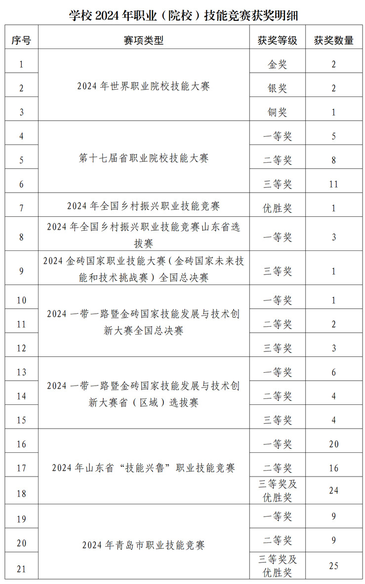 在2024年山東省“技能興魯”職業(yè)技能競賽中,學(xué)校師生獲一等獎20項(xiàng)、二等獎16項(xiàng)、三等獎及優(yōu)秀獎24項(xiàng)。在青島市第十七屆職業(yè)技能競賽中獲一等獎或金獎9項(xiàng)、二等獎或銀獎9項(xiàng)、三等獎及優(yōu)勝獎25項(xiàng)。另外,學(xué)校師生在山東省大學(xué)生科技節(jié)、海峽兩岸職業(yè)院校技能競賽、各類國家級協(xié)會組織主辦的技能競賽等省級以上賽項(xiàng)中獲獎100余項(xiàng)。