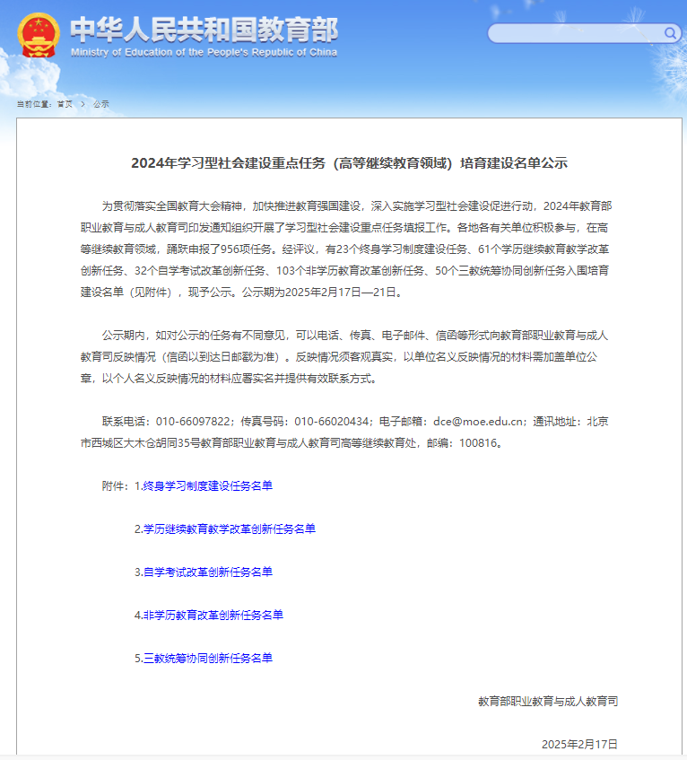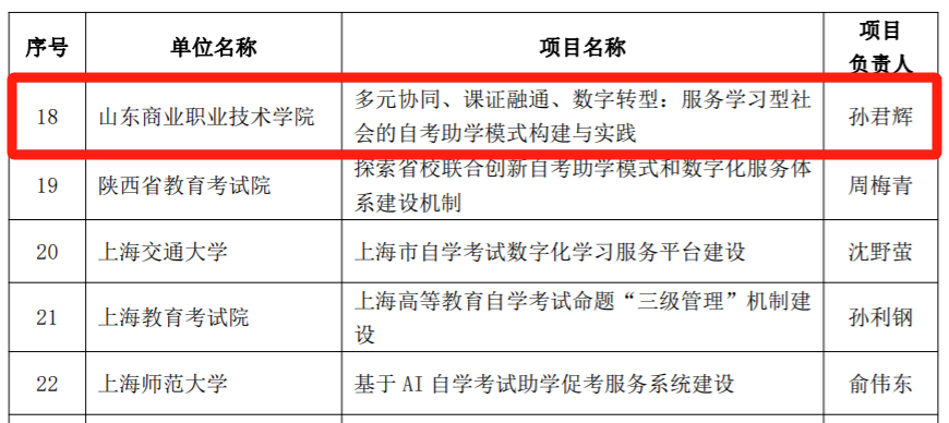 經(jīng)教育部專家評議,在高等繼續(xù)教育領(lǐng)域956項任務(wù)中,共評選出23個終身學(xué)習(xí)制度建設(shè)任務(wù)、61個學(xué)歷繼續(xù)教育教學(xué)改革創(chuàng)新任務(wù)、32個自學(xué)考試改革創(chuàng)新任務(wù)、103個非學(xué)歷教育改革創(chuàng)新任務(wù)、50個三教統(tǒng)籌協(xié)同創(chuàng)新任務(wù)入圍培育建設(shè)名單。山東商職學(xué)院憑借在服務(wù)區(qū)域?qū)W習(xí)型社會建設(shè)、推動職業(yè)教育、高等教育與繼續(xù)教育融合發(fā)展方面的創(chuàng)新實踐與顯著成效,與眾多知名高校同時入選自學(xué)考試改革創(chuàng)新任務(wù)。該項目在山東省教育招生考試院指導(dǎo)下,聯(lián)合山東大學(xué)等主考院校,著力構(gòu)建協(xié)同創(chuàng)新機制、思政教育與技術(shù)教育融合機制、課程實踐考核置換機制和監(jiān)督保障機制,打造“一站式”學(xué)習(xí)服務(wù)平臺,推動高等教育自學(xué)考試的數(shù)字化轉(zhuǎn)型升級。