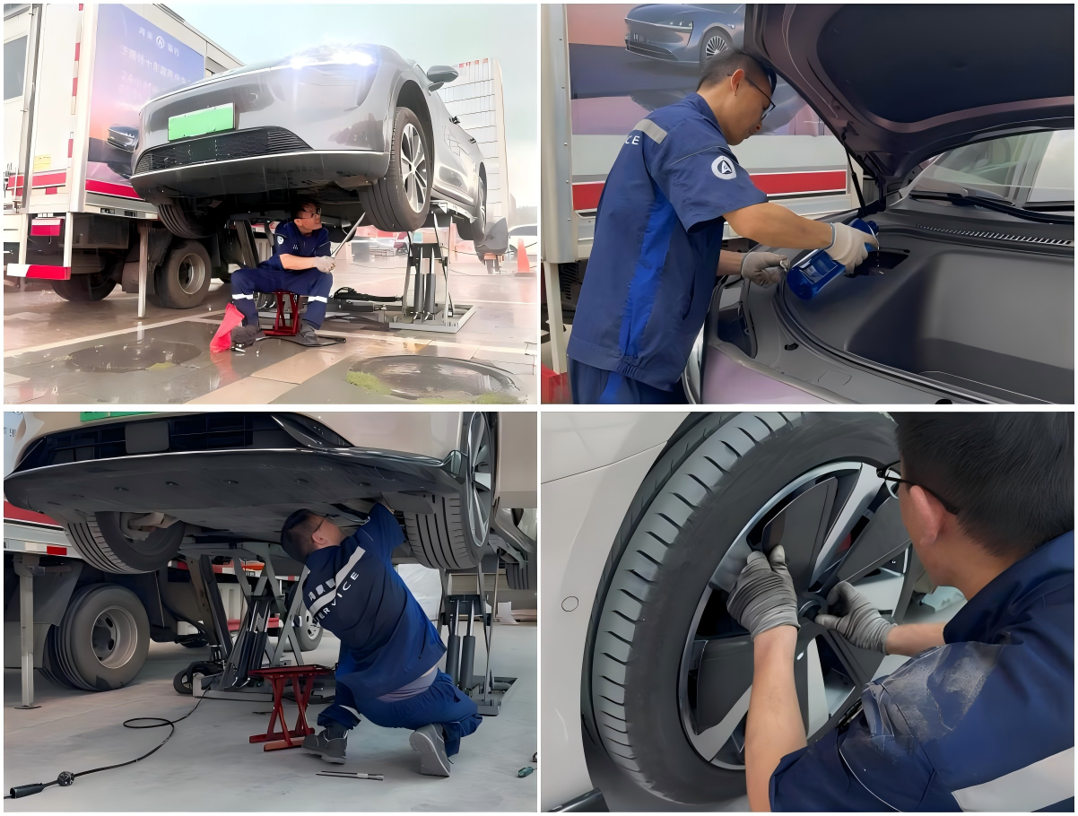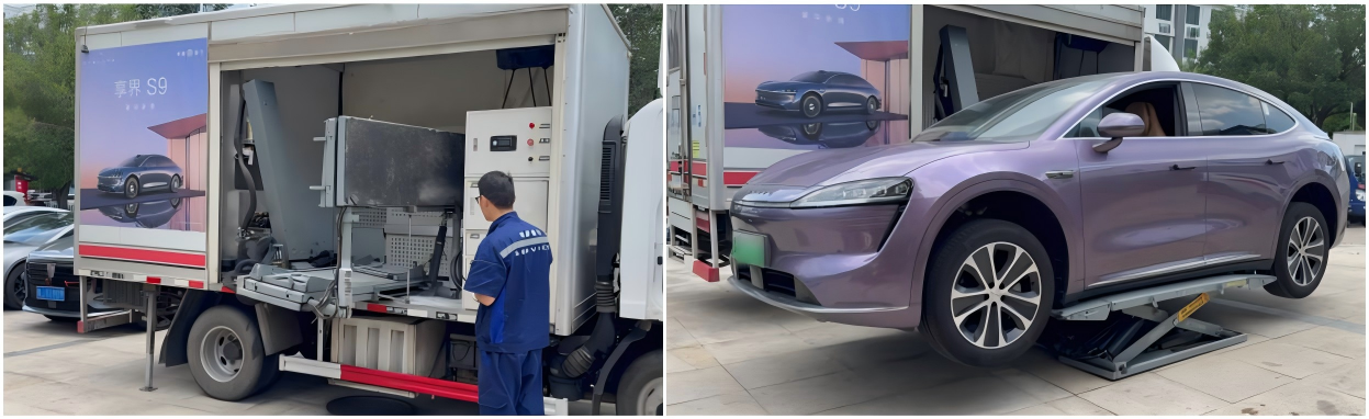 多功能移動服務車配備新能源診斷儀、車輛舉升機、全套檢修工具等設備,技術標準與店內完全一致。
