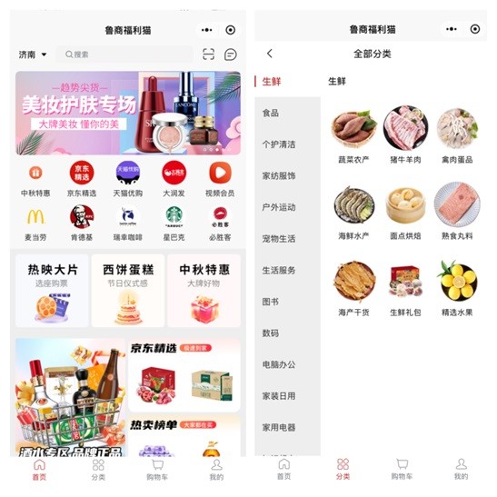 福利卡券可在“魯商福利貓”平臺進行消費,平臺涵蓋300+蛋糕品牌、10000+蛋糕門店、10000+影院,為員工提供了廣泛的美食休閑選擇。平臺還整合了京東、天貓等知名電商的供應鏈資源,涵蓋22大商品品類、70000+商品,確保商品品質與種類的豐富性。此外,平臺還支持美團、肯德基、星巴克等生活性消費,滿足員工日常生活的多樣化需求。