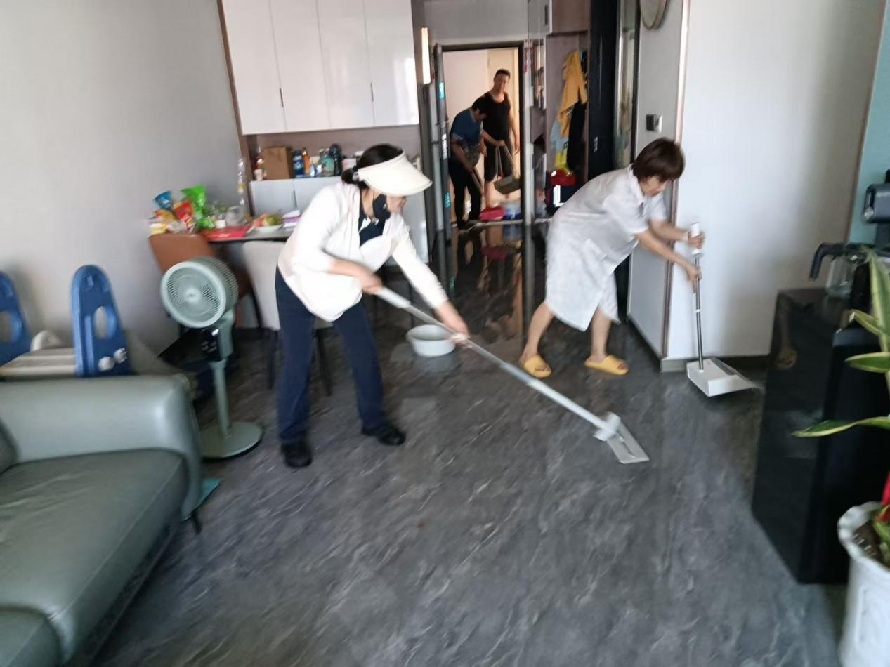 待業主趕回,打開家門看到的是一片狼藉的淹水場景,物業團隊在征得業主同意后迅速進入,確定漏水原因為廚房角閥因長期使用老化爆裂。與此同時,其他工作人員利用拖把、水桶等工具全力清理室內積水,盡力縮短家具、地板的浸泡時間。經過一個多小時的努力,屋內積水被徹底清除,工作人員還貼心給予了后續處理建議。物業團隊的迅速響應、高效處置和盡責態度,讓業主深受感動,特地制作錦旗以表感激。