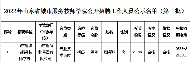 根據(jù)《中共山東省委組織部、山東省人力資源和社會保障廳關(guān)于印發(fā)2022年度省屬事業(yè)單位公開招聘工作實施方案的通知》(魯人社發(fā)〔2021〕18號)等相關(guān)規(guī)定,山東省城市服務(wù)技師學(xué)院經(jīng)過公開招聘報名、考試、考察、體檢等工作,現(xiàn)對擬聘用人員(第三批)進行公示,公示期為7個工作日,自2022年12月9日至2022年12月19日(不含節(jié)假日)。公示期間,如對公示人選有異議,請及時向山東省商業(yè)集團有限公司反映。